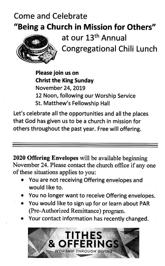 In response to God's love, St. Matthew's is a faith community welcoming all to grow in faith, to worship Christ and to reach out to everyone
