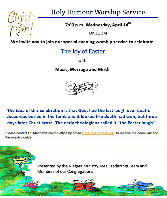 You are invited to join us on Wednesday, April 14 at 7:00 p.m. for a Holy Humour Worship Service presented by the Niagara Area Ministry Leadership Team and Members of our Congregations. This special evening worship service celebrates the Joy of Easter with music, message and mirth. The idea of this celebration is that God had the last laugh over death. Jesus was buried in the tomb and it looked like death had won, but three days later Christ arose. The early theologians called it “the Easter laugh!”