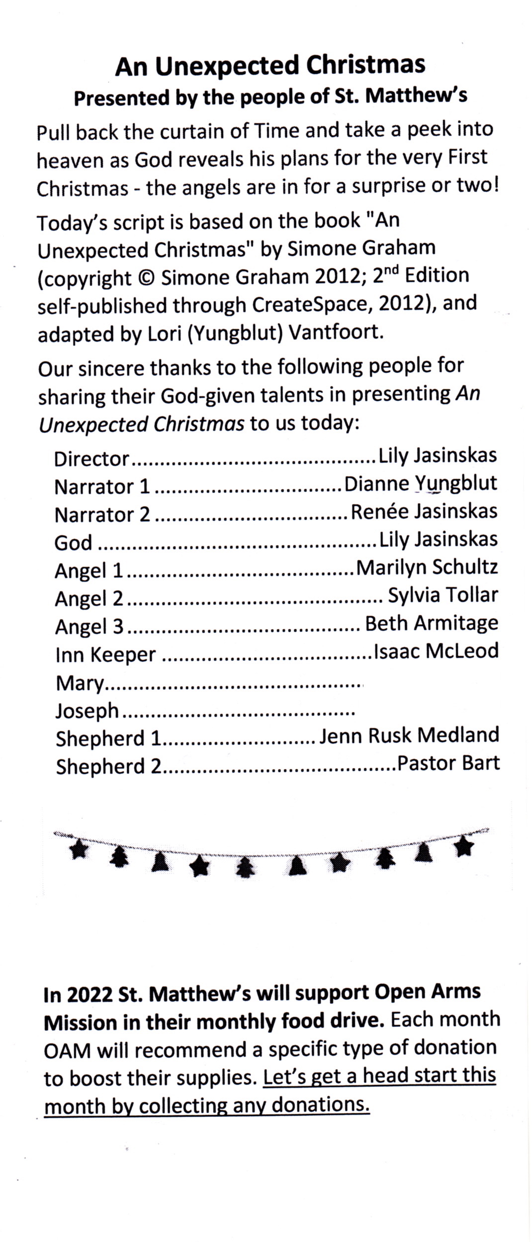 4th Sunday in Advent – December 19, 2021 (Our Last In-person Worship Service till Further Notice)