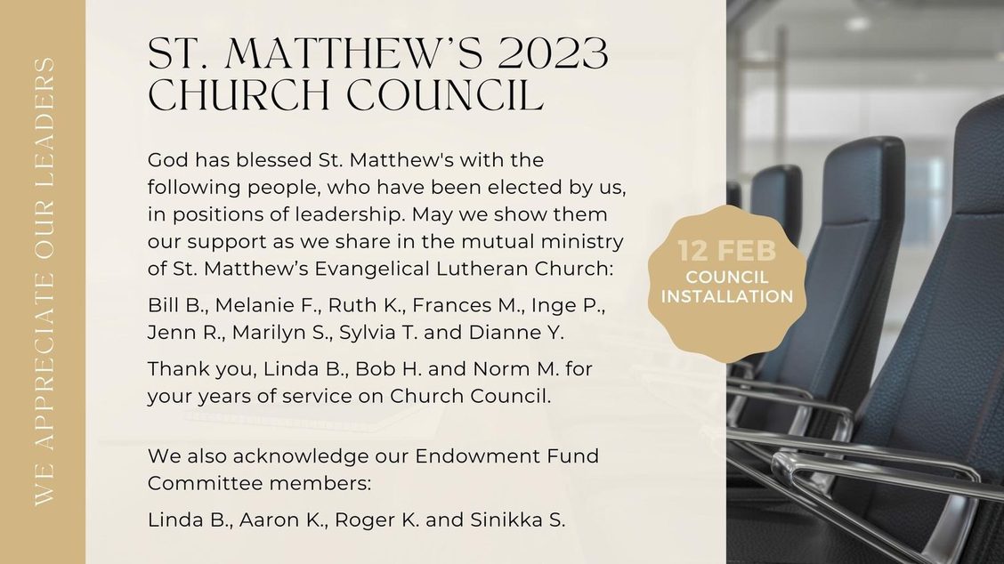 In response to God's love, St. Matthew's is a faith community welcoming all to grow in faith, to worship Christ and to reach out to everyone