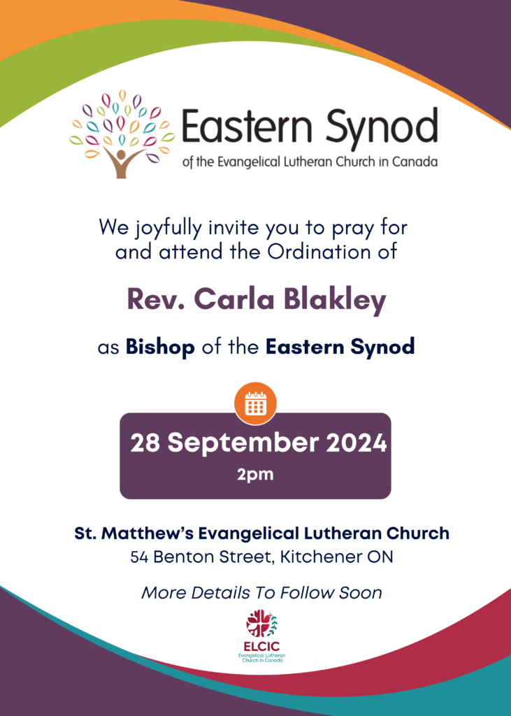 “ It is with great delight that we invite you to the ordination of Rev. Carla Blakley as Bishop of the Eastern Synod. The ordination service will take place Saturday, September 28, 2024 at St. Matthews Evangelical Lutheran Church, 54 Benton St., Kitchener, ON N2G 3H2 starting at 2:00 pm. A reception will follow.”