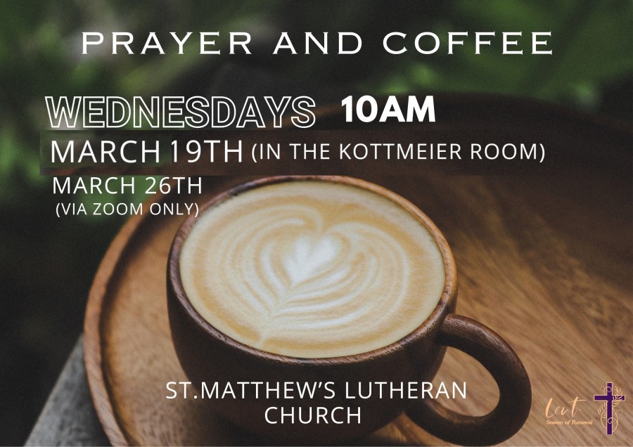 If you are unable to attend this Prayer and Coffee session in-person, contact Pastor Bart to receive an invitation and link to join ZOOM.