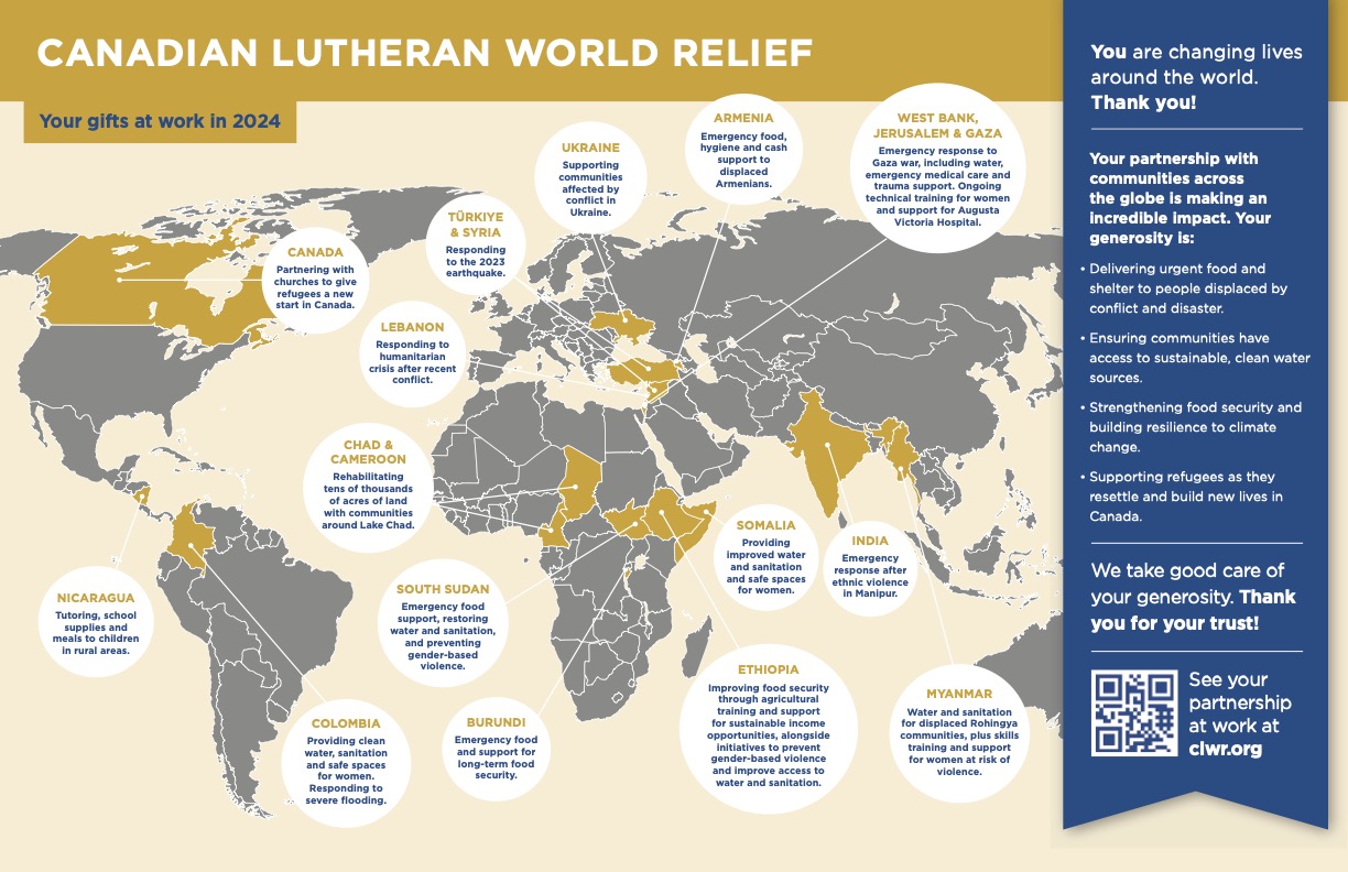 Founded in 1946, Canadian Lutheran World Relief (CLWR) is a Lutheran international aid charity that aims to respond to the causes of poverty and suffering. CLWR runs four programs: Humanitarian Response, Food Security and Livelihoods, Educations and Skills, and Refugee Resettlement. Donations can be made through our church or online.