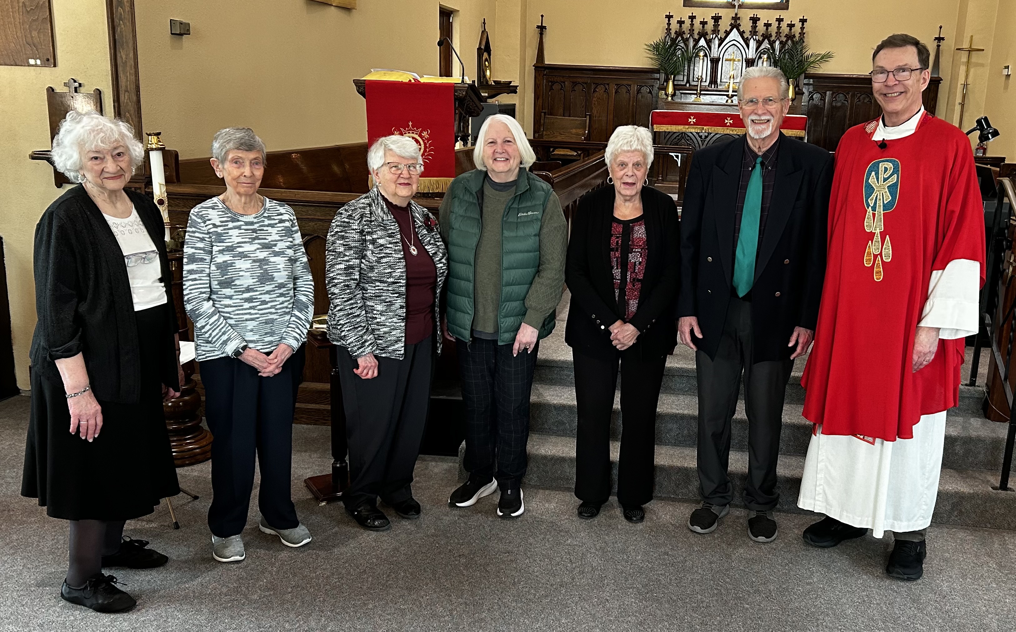 L->R Carole McLeod, Beryl Bowen, Marilyn Schultz, Bobbye Goldenberg, Ruth Kiers, Bob Hansen, Pastor Bart Coleman