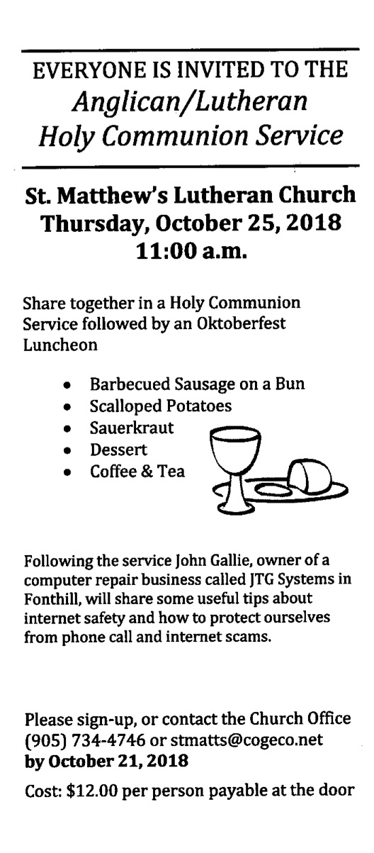Anglican/Lutheran Communion Service and Oktoberfest Lunch – October 25th