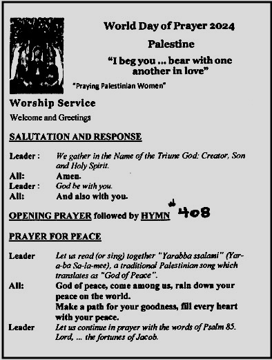 First Evangelical Lutheran Church, in Pt. Colborne, hosted the World Day of Prayer 2024 worship service on Thursday, March 1, 2024 at 2pm. Below is the Worship Guide, World Day of Prayer 2024 Palestine – “I Beg You.. Bear With One Another in Love”, that we followed on that day.